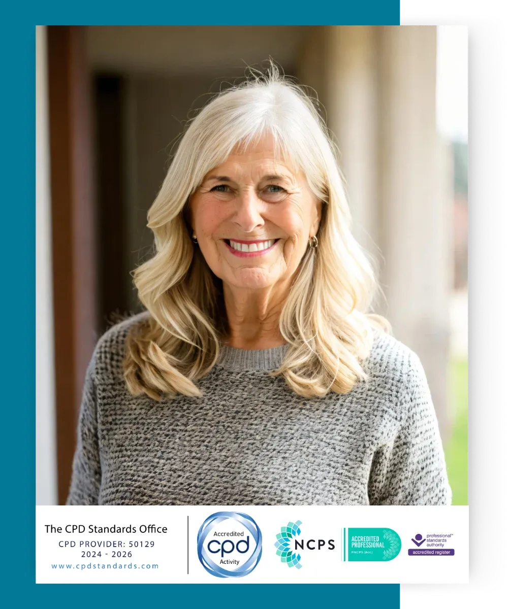 PhD. MA. Dip Couns. MBACP (Accred). Cert Ed. HV.RGN.
